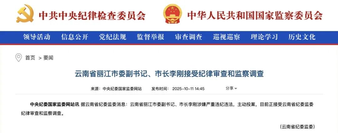 【丽江市市长李刚,主动投案】据云南省纪委监委消息:云南省丽江市委副书记、市长李刚涉嫌严重违纪违法,主动投案,目前正接受云南省纪委监委纪律审查和监察调查。